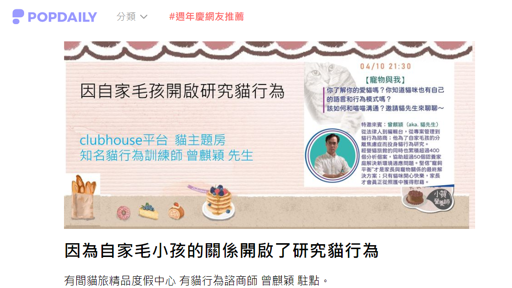 貓行為諮商師 曾麒頴 駐點的溫馨雅致貓旅舍 https://www.popdaily.com.tw/forum/pet/1244081 高熱量美食擁護者小賀營養師 https://usershzr.pixnet.net/blog/post/36145876 回上一頁