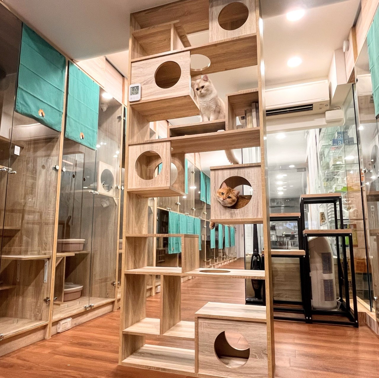 為抱持著這樣的服務信念,我們專注在貓旅館內每一間貓房與公共空間的設計:各種高度相銜接的跳台、隱密的躲藏空間與小閣樓,可隨意堆疊轉向的骰子貓窩,多重選擇的遊樂動線,為住宿貓咪構築了各自獨立專屬的核心領域,以及豐富多變而不互相干擾的公共活動空間。